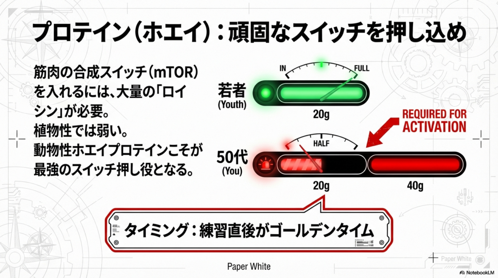 - なぜ?: 頑固になった筋肉の合成スイッチ(mTOR)を無理やりオンにするには、アミノ酸の一種である「ロイシン」が大量に必要です。植物性よりも動物性、特にホエイプロテインが最強のスイッチ押し役になります 。