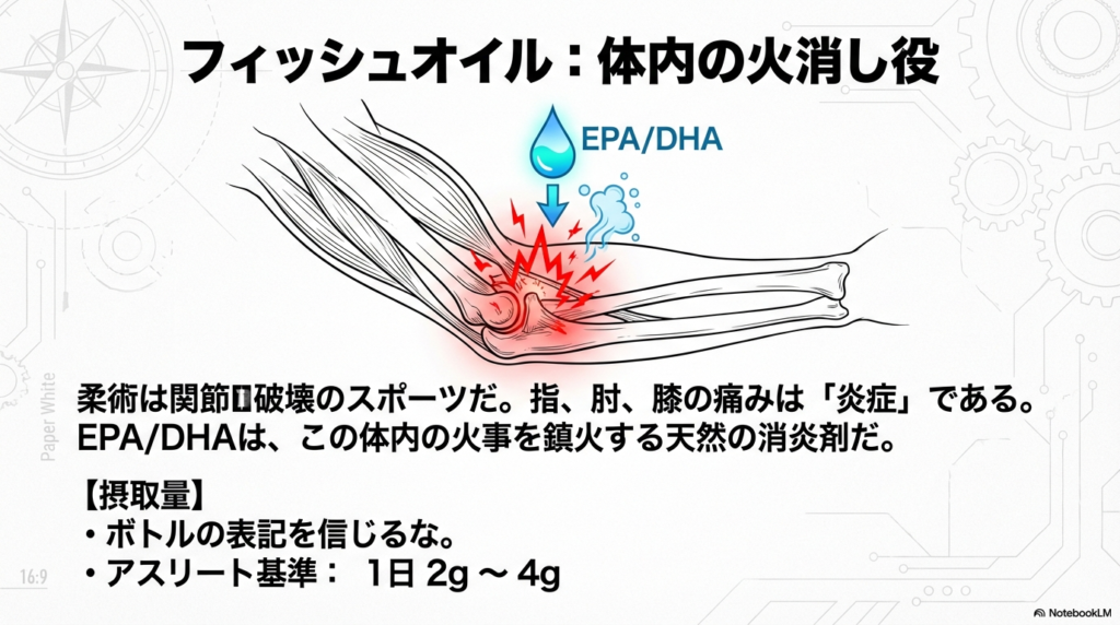 - なぜ?: 柔術は関節を酷使するスポーツです。指、肘、膝…どこかしら痛くないですか?フィッシュオイルは体内の炎症を火消しする「天然の消炎剤」です 。