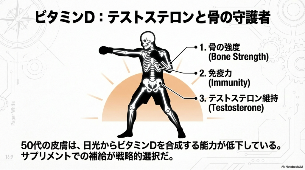 - なぜ?: 骨の強度と免疫力、そして男性ホルモン(テストステロン)の維持に関わります。50代は日光を浴びてもビタミンDを作る能力が落ちているので、サプリで補うのが賢い選択です 。